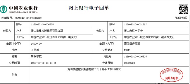 截止7月23日下午,共收到92人愛(ài)心捐款15000元。款項(xiàng)已于當(dāng)日下午全部匯入黃山市紅十字會(huì)捐贈(zèng)賬戶。